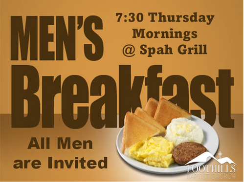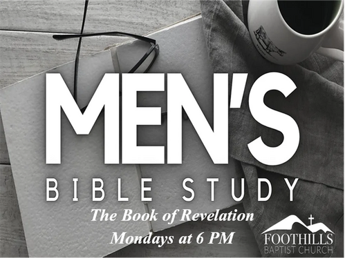 We have a group of active men at Foothills Baptist Church. On Monday evenings, we are currently studying the book of Revelation. After John was exiled on the Isle of Patmos, he was given a vision from the Lord for him to write down concerning the end times. From the letters to the seven churches to the New Heaven and New Earth, Revelation is wonderful study that will make you shout "Worthy is the Lamb that was slain." All men are welcome to join us on Monday evenings at 6 in the church conference room, and 7:30 Thursday Mornings at Spah Grill for great fellowship, and great breakfast. Come join us!